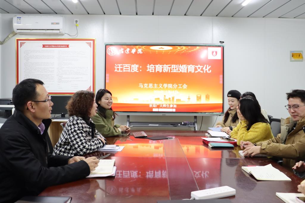 12月16日下午,马克思主义学院分工会于学院二楼会议室举办“迁百度:培育新型婚育文化”专题讲座。马克思主义学院副院长陈丽杰教授以青年人关注度极高的婚姻类综艺《再见爱人》为切入,开展“树立健康的婚恋观”为主题的授课。学院青年教师代表参加会议。