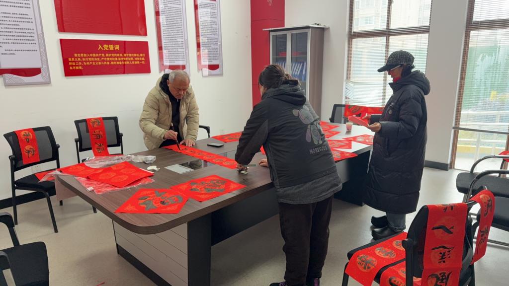 “老师,请您帮我写这副对联。”“老师,还是手写对联更有年味儿!”。2月5日上午,在宿城区隆城世嘉小区党群服务中心内,小区居民排队领取春联和福字。校工会副主席、校工会书法俱乐部牵头人曹志成一边挥毫,一边与现场人员亲切交谈。今年,也是校工会书法俱乐部连续第三年为隆城世嘉小区居民义务书写春联,传递中华优秀书法文化,弘扬优秀春节民俗。短短两个小时,小区居民就领到了20多副春联和近100个福字。